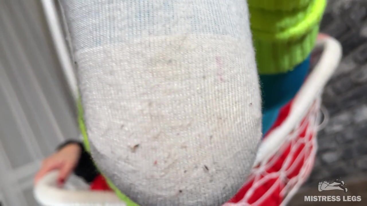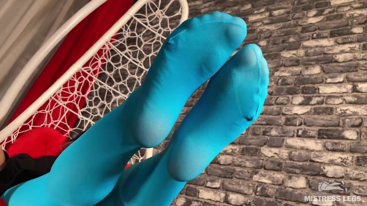 Mistress foot teasing you in hanging chair in white dirty socks and blue tights