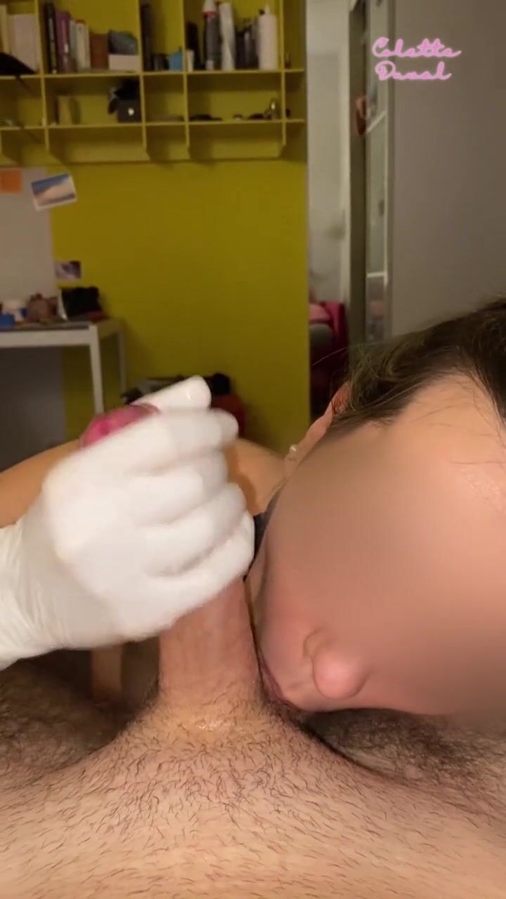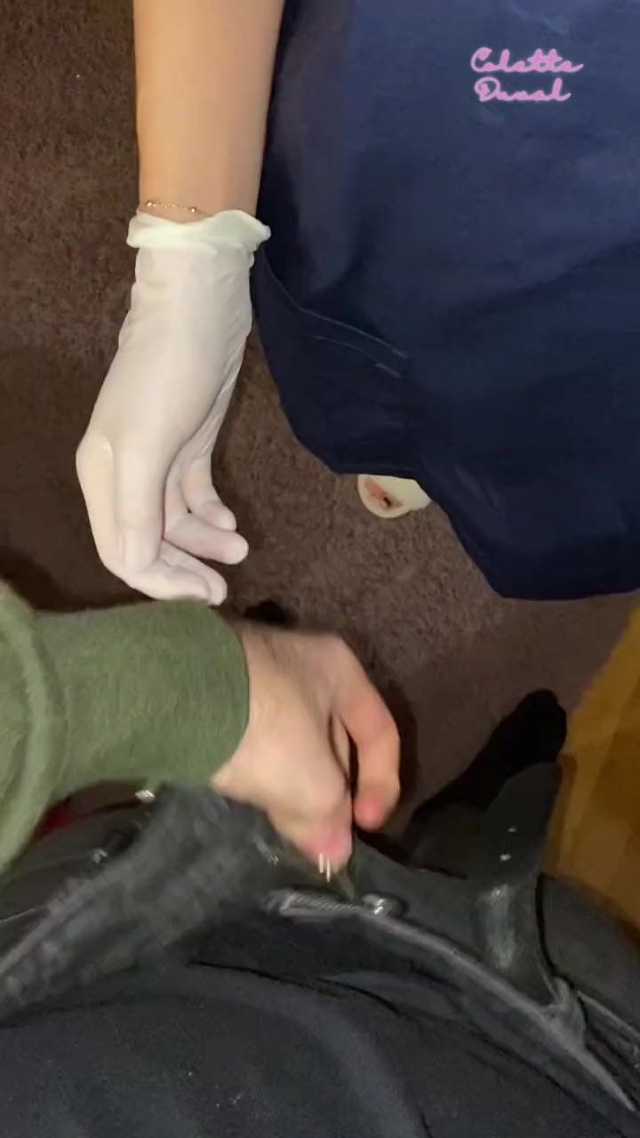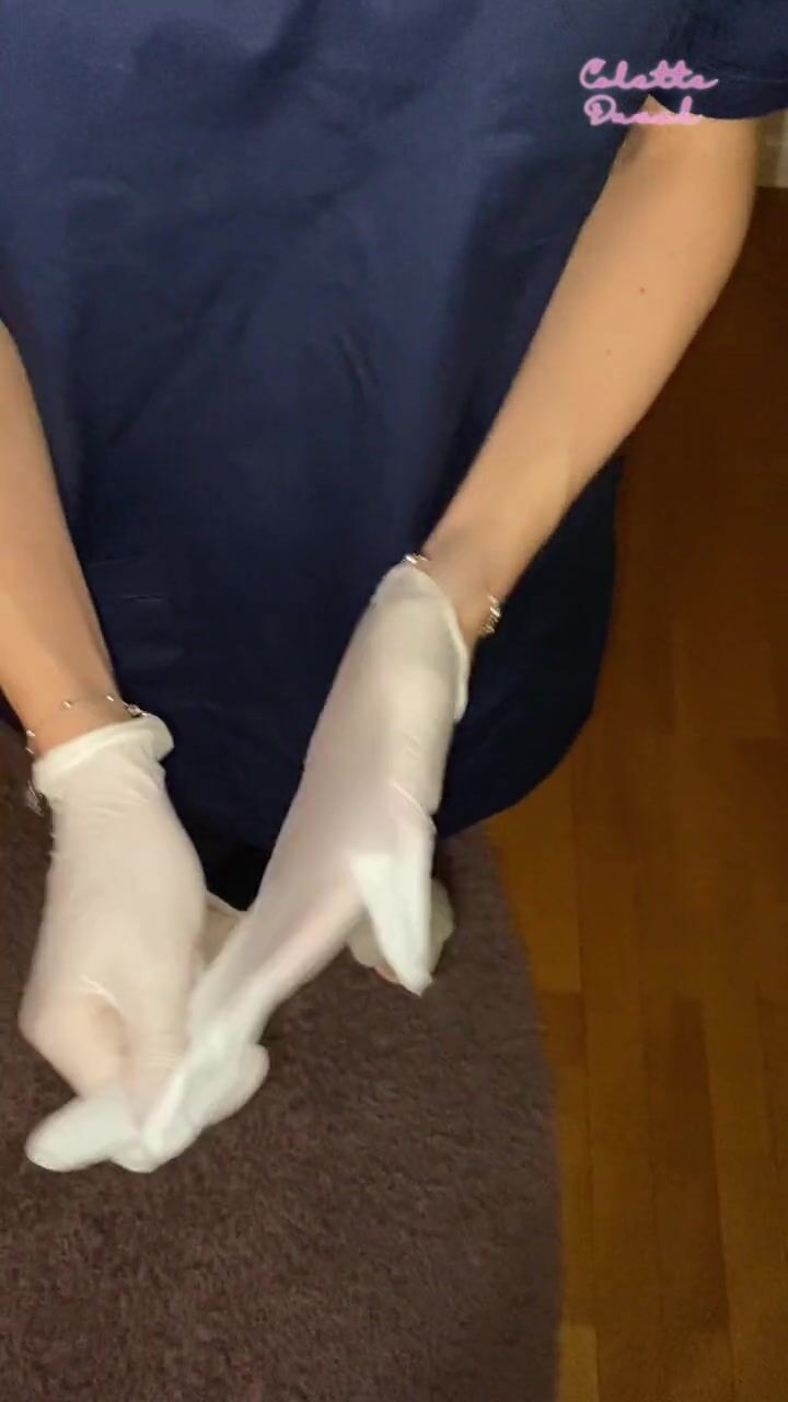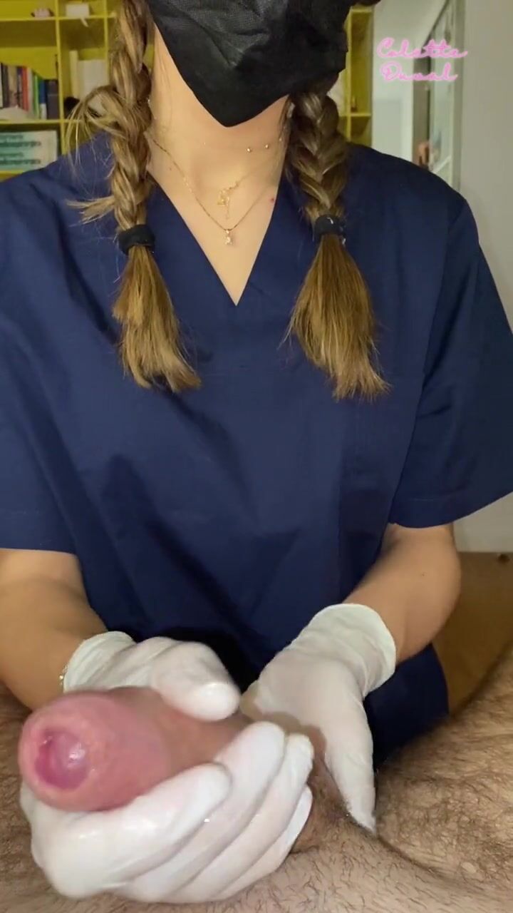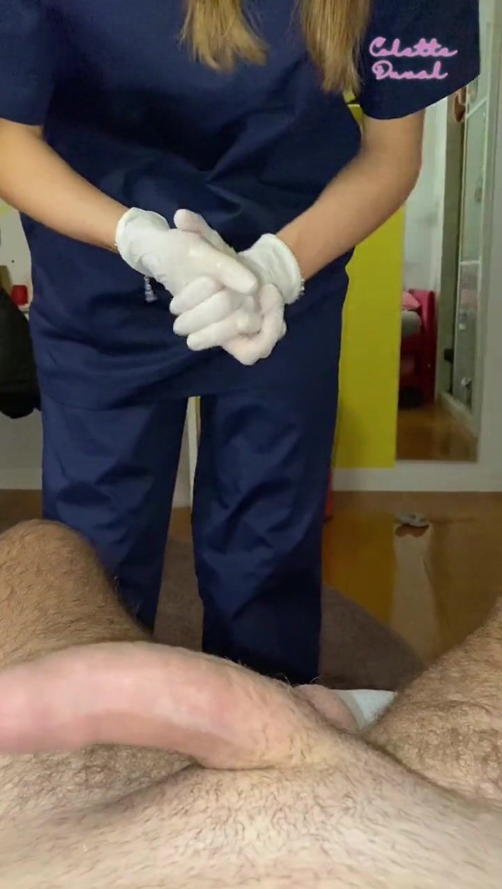 NURSE student couldn't resist using LATEX GLOBES to jerk her PATIENT'S hard cock