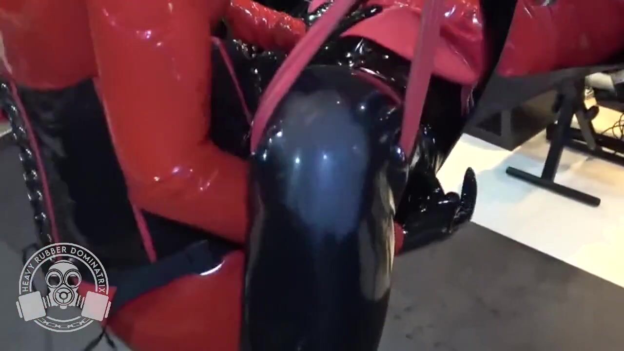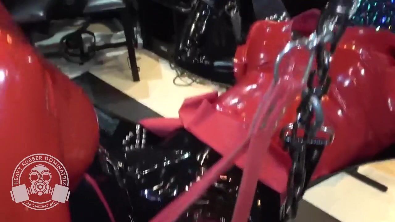 Red Rubber Doll Gets Pegged in Sling - Lady Bellatrix in latex catsuit with strapon