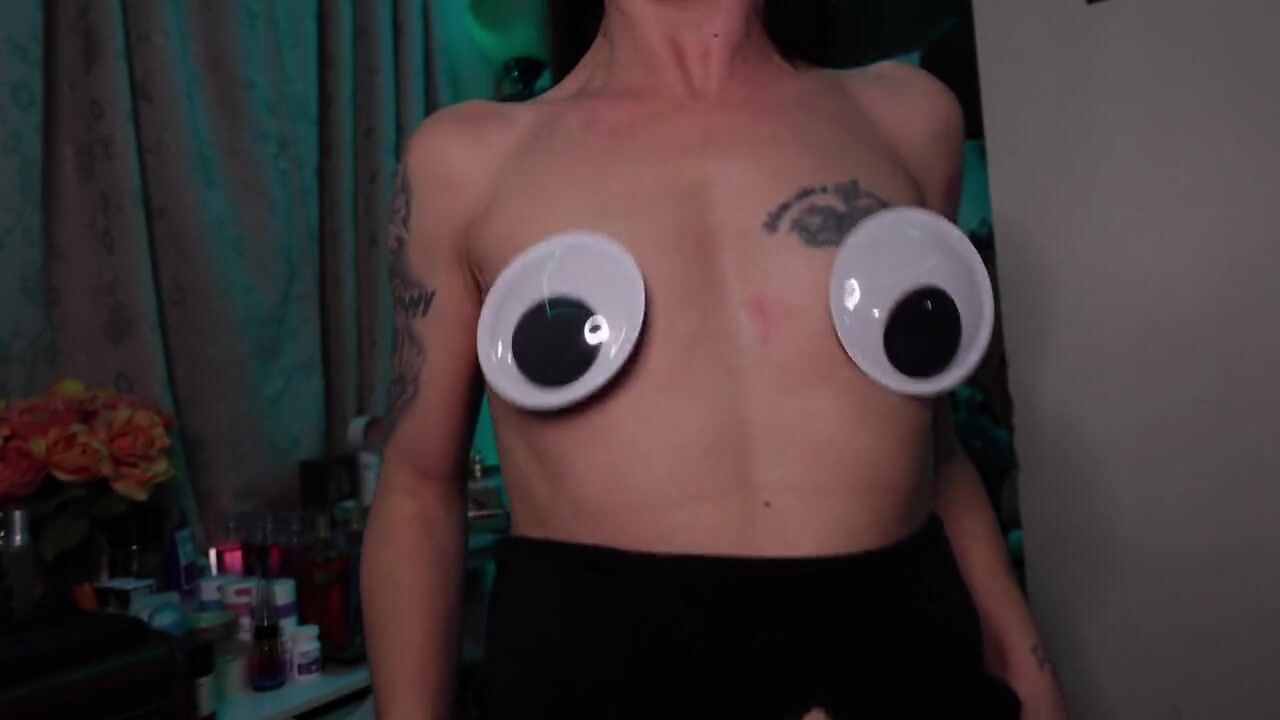 Dutch girl with needle pierced tits sucks cock and gets his cum in her eye